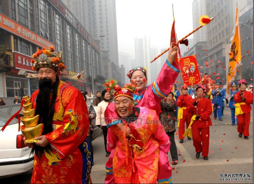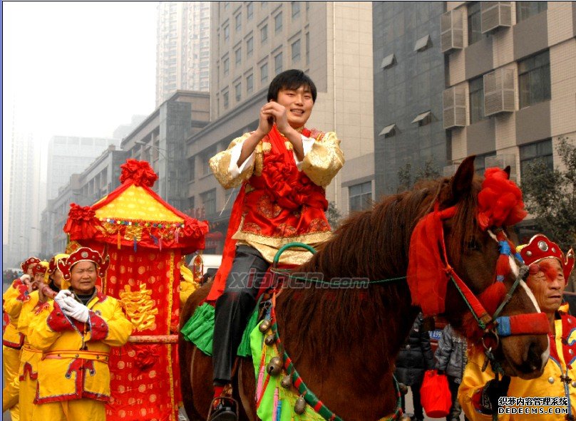 西部新闻网消息:(记者 李臻 张龙 西安晚报记者李福民 )昨日上午,西安市 西荷花园(原西何家村)一支很特别的迎亲队伍引得不少路人关注,新郎王超身披唐装,骑着高头枣红大马,前有媒婆公公引路,后有西洋、中式锣鼓队奏乐,八名关中汉子抬着大红轿子晃晃悠悠地行走在人来车往的马路上,迎亲队伍更有举着“迎亲”牌子和手持元宝的“财神”助阵。看到如此新奇的迎亲队伍,整条街道的路人、车辆无不驻足观看,并向新人道贺。
