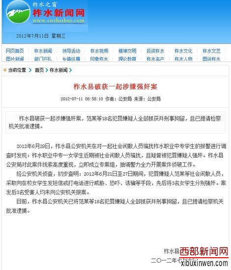 西部新闻网消息(文风 华商报记者 魏光敬)  近日,柞水县发生一起社会闲散人员利用诱骗、胁迫等手段强奸女中学生案件,在社会上产生恶劣影响,引来社会不实的传言。为此,柞水县委、县政府高度重视,下令全力侦破,警方出动50多名警力,两天内抓获全部18名涉案人员。