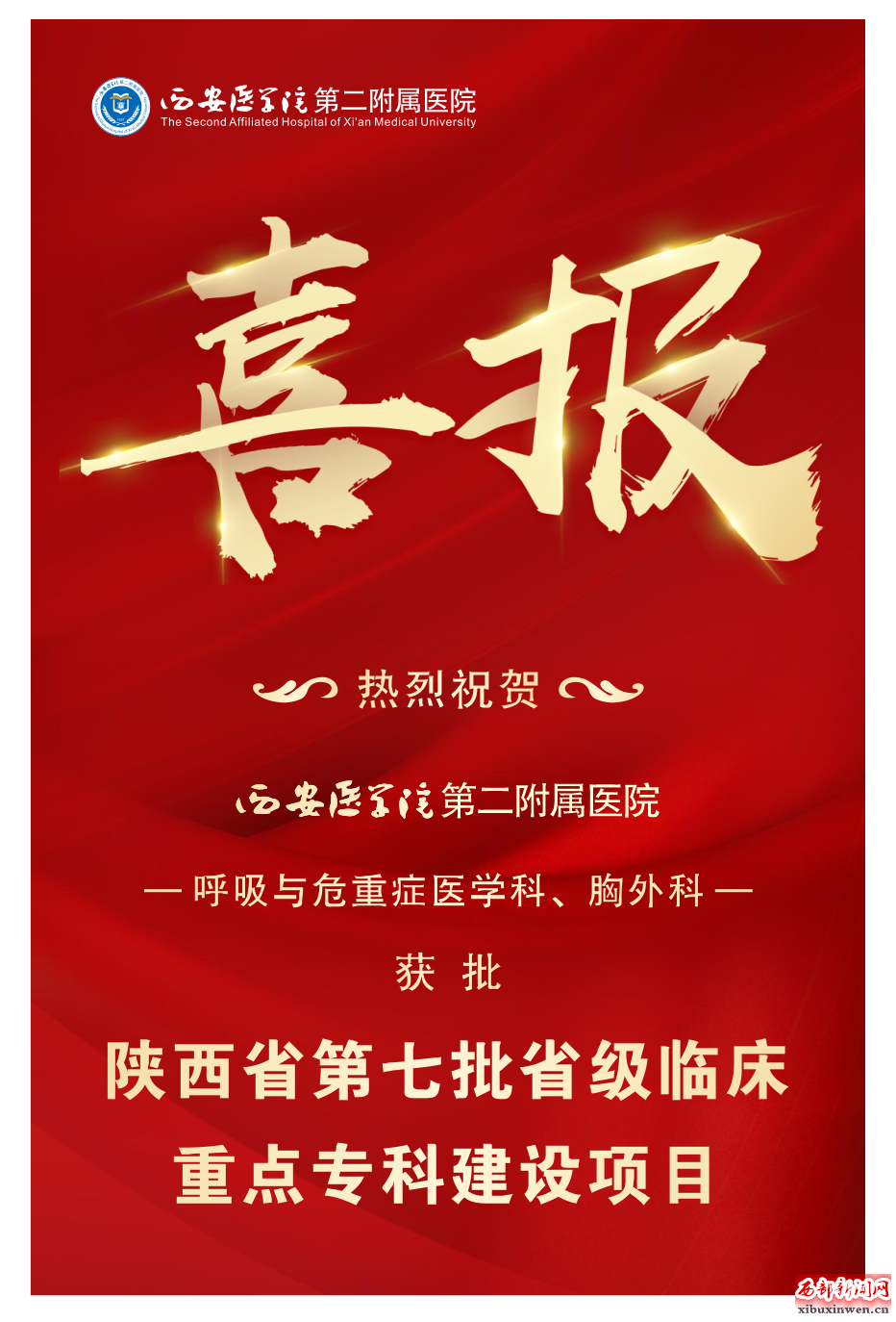 阳光讯(记者 郑亚雷)近日,陕西省卫生健康委员会正式公布第七批省级临床重点专科建设项目名单。西安医学院第二附属医院呼吸与危重症医学科、胸外科凭借深厚的学科积淀、强劲的技术实力与优质的医疗服务,经过机构自评、省级评审、网络公示等多轮严格遴选,成功获批。这一喜讯不仅是对两个科室多年来深耕细作、精益求精的高度肯定,更是西安医学院第二附属医院在学科建设道路上稳步前行、再创佳绩的有力见证。