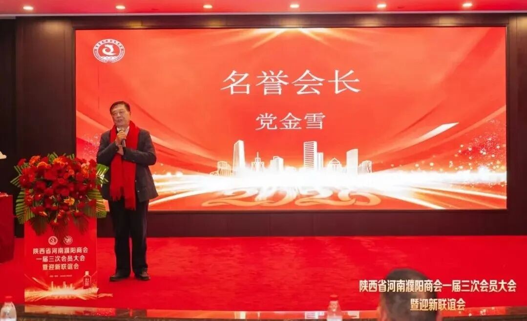 党金雪名誉院长致辞,他说:“今天,古城西安乡情浓浓。我是濮阳台前人,今天出席陕西省河南濮阳商会一届三次会员大会暨党建、会建联谊会,与各位乡亲欢聚一堂、共叙桑梓情谊、共商发展大计,我内心满是激动与自豪。首先,衷心感谢商会的信任与厚爱,聘任我为名誉会长,这份荣誉承载着乡贤们的期许,更让我深感肩上沉甸甸的责任—为同乡服务、为商会助力、为豫陕两地的情谊与发展搭桥铺路,是我义不容辞的使命。值此2026马年新春即将到来之际,衷心祝愿各位领导、各位乡贤身体健康、事业兴旺、阖家幸福、马年大吉!祝愿陕西省河南濮阳商会越办越好,凝聚力越来越强,成为豫陕乡贤最坚实的依靠、最温暖的港湾!