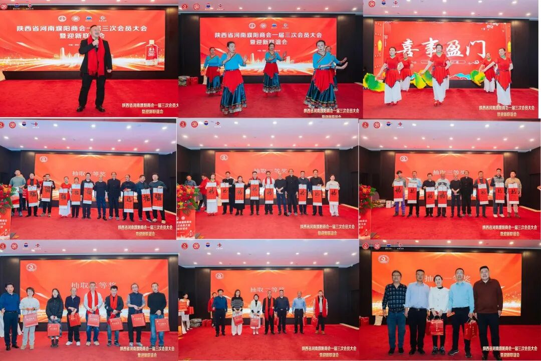 晚宴现场乡韵悠长,陕西省洛阳商会会长周长伟倾情献唱曲剧《卷席筒》选段,熟悉的唱腔勾起了在场乡贤的故土记忆,赢得阵阵喝彩;豫剧表演、舞蹈节目轮番上演,为晚宴增添了浓郁的文化气息。抽奖环节惊喜不断,马年福字、濮阳陈学习地道调料大礼包、孝道文化专属厚礼及茅台尊享礼盒等丰厚奖品相继送出,30名幸运奖、20名二等奖、3名一等奖得主依次诞生,现场欢声笑语不断。有西安河南许昌商会选送的舞蹈节目,更是把整台晚会推向了高潮。