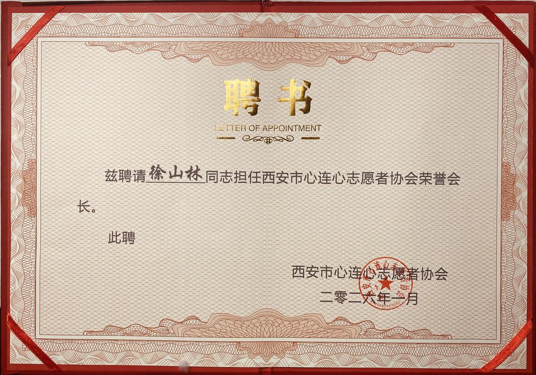 此次聘任与文化题赠,不仅为协会带来了宝贵的公益引领经验、深厚的文化底蕴赋能与强大的精神感召力,更凝聚了社会各界对公益事业发展的广泛共识与坚实行动合力。展望未来,西安市心连心志愿者协会将携手徐山林同志、张龙教授及社会各界爱心力量,持续聚焦基层帮扶、社区服务、文化传承、公益传播等重点领域,不断丰富志愿服务内涵、提升服务精准度与实效性,让志愿精神深度融入城市发展肌理,让公益温暖与文化力量相互激荡,共同浸润更多群众心田,为三秦大地的公益事业与文明建设书写更加绚烂的篇章。(张栢溪)