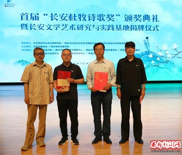 行进: 西安长安杜牧文化研究会参与发起并协办了首届“长安杜牧诗歌奖”活动。活动共征集到来自全国32个省市自治区和海外近500位诗人的3300多首诗作,以及40余位诗评人的50余篇诗歌评论,最终有14位诗人、作家的作品获奖。2024年2月,长安作家协会对外公布获奖名单,获奖作品刊登在第八期《长安文学》杂志。这次活动更进一步继承和发扬了杜牧的文学精神,长安作家协会与西京学院传媒学院在典礼现场,共同设立“长安文学艺术研究与实践基地”,为校内外文学与音乐的交流搭建起桥梁,加强校地融合,活跃文学艺术创作氛围。领奖那天下午,“长安杜牧诗歌奖”的获奖作者及部分嘉宾,还专程参观游览了杜公祠、兴教寺、司马村杜氏祖茔等地,并在我们司马村杜牧纪念馆作了交流,以文艺之力量宣传展示长安魅力。